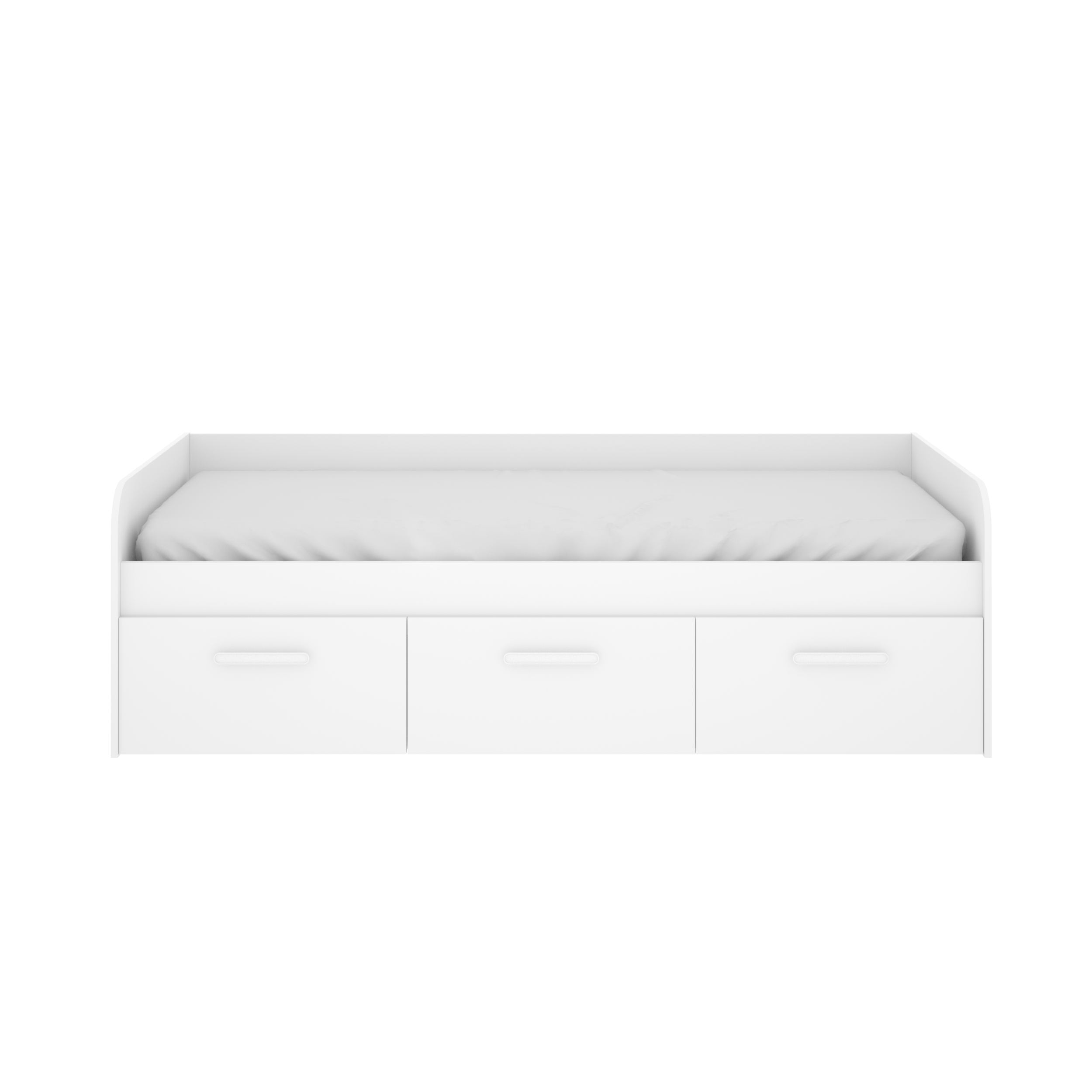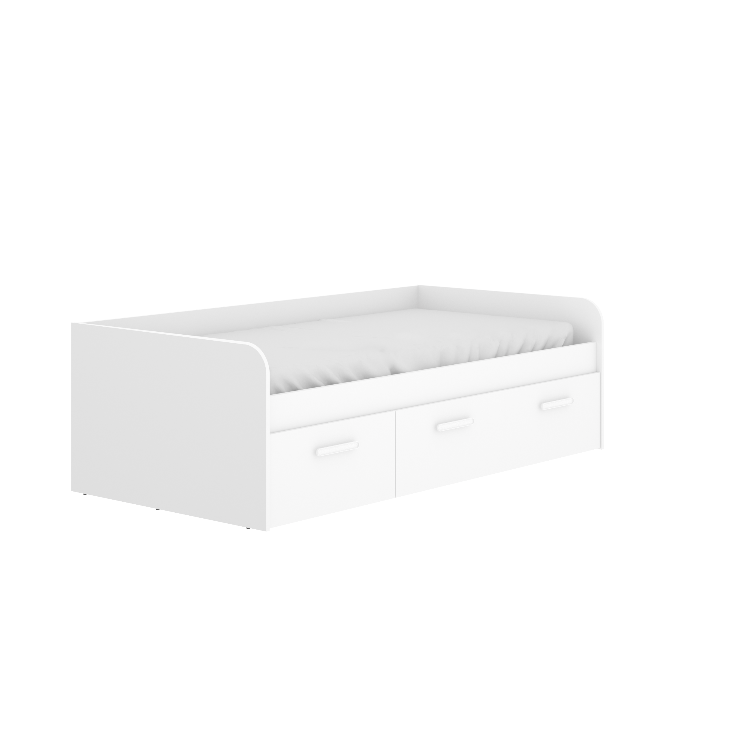 una cama nido con tres cajones, marca Mek, en color blanco y con medidas de 60x194x97 cm. La cama nido es un tipo de cama que tiene una cama adicional debajo de la principal, y que puede sacarse y utilizarse como una cama individual separada.
