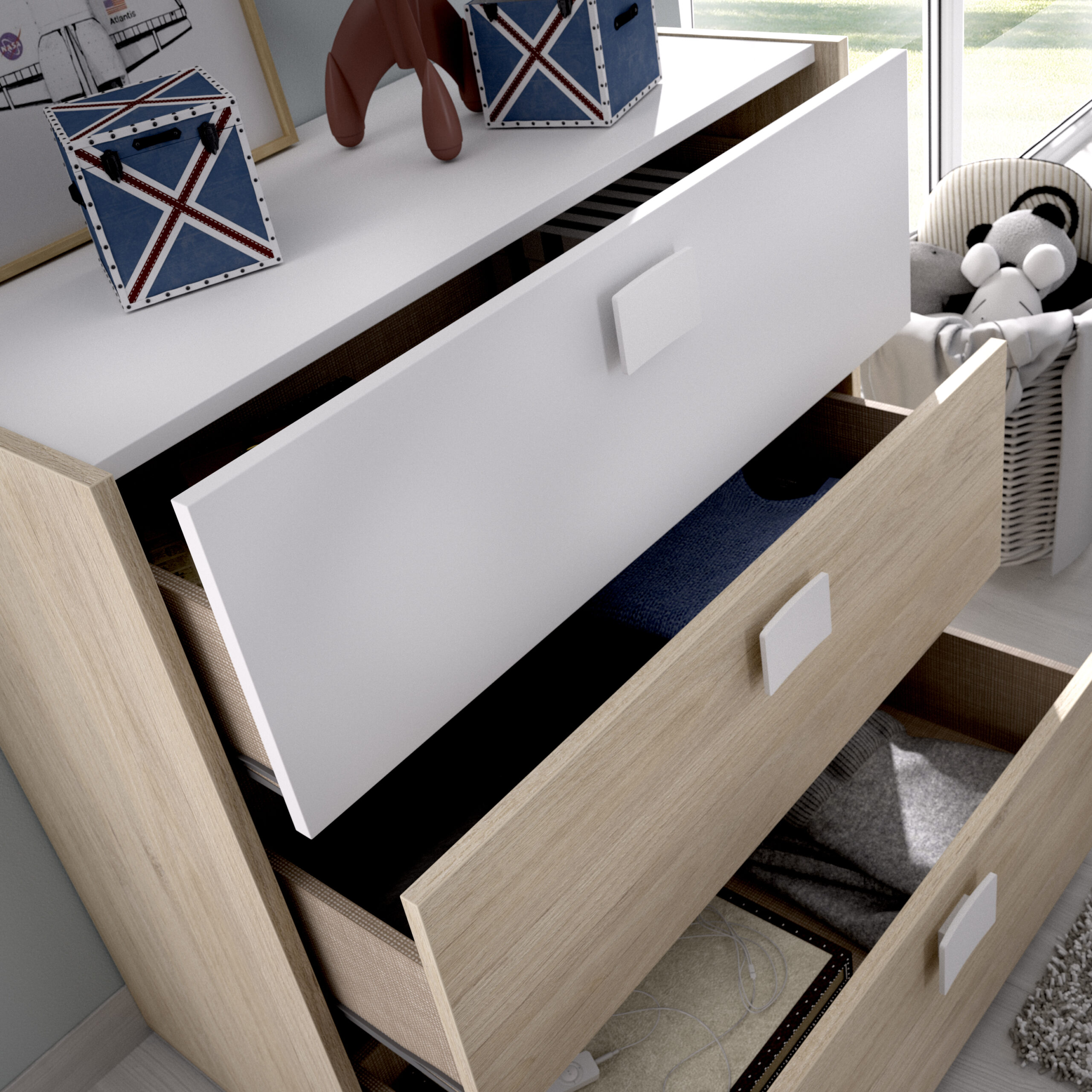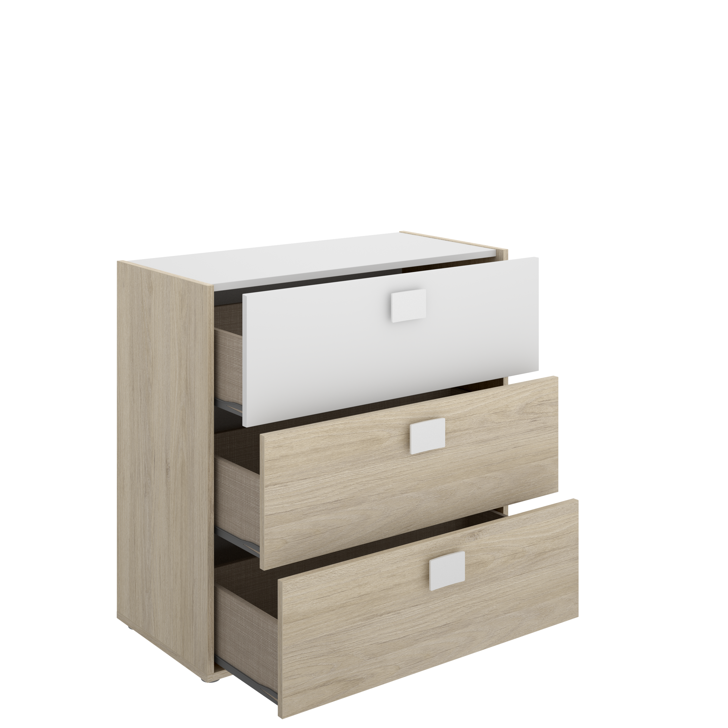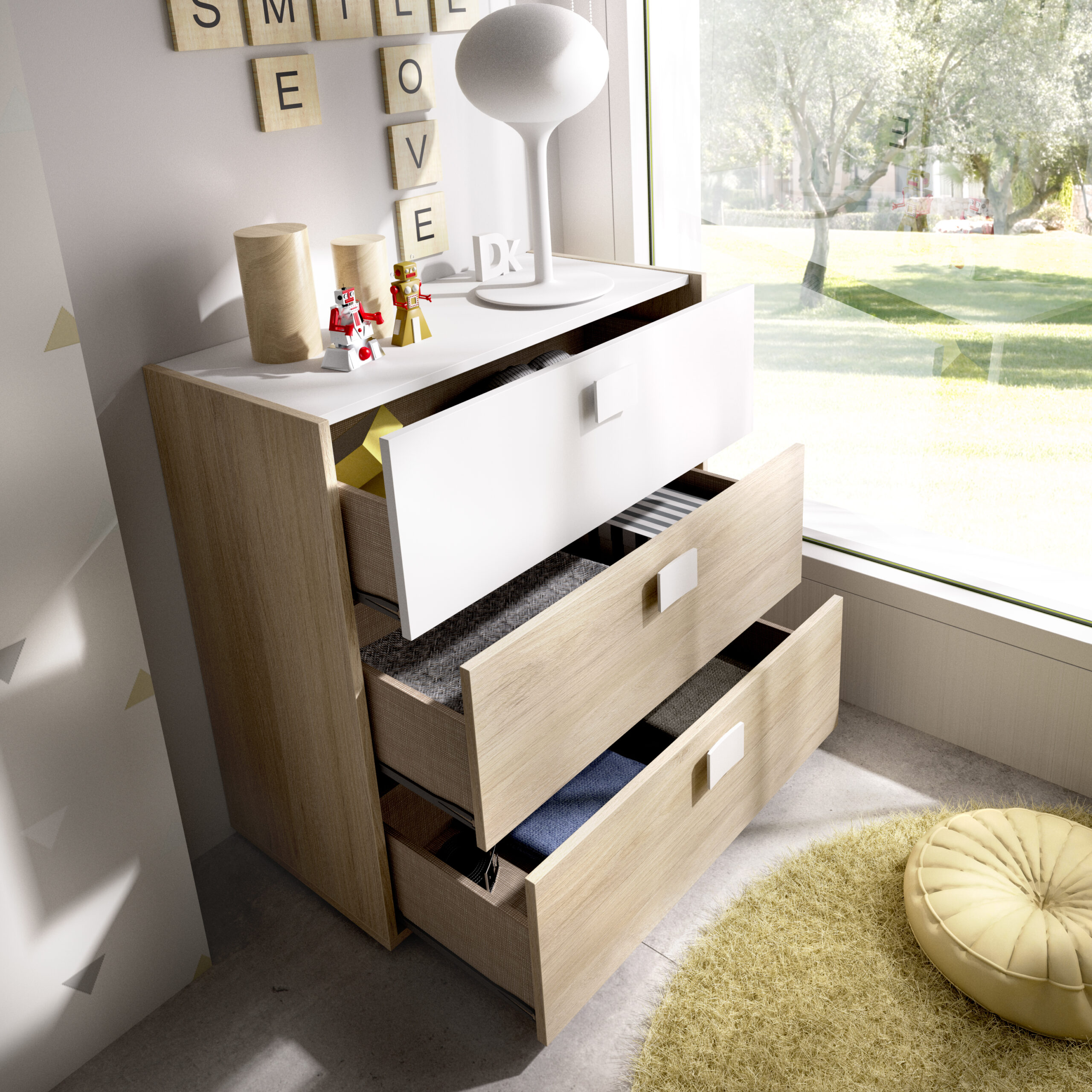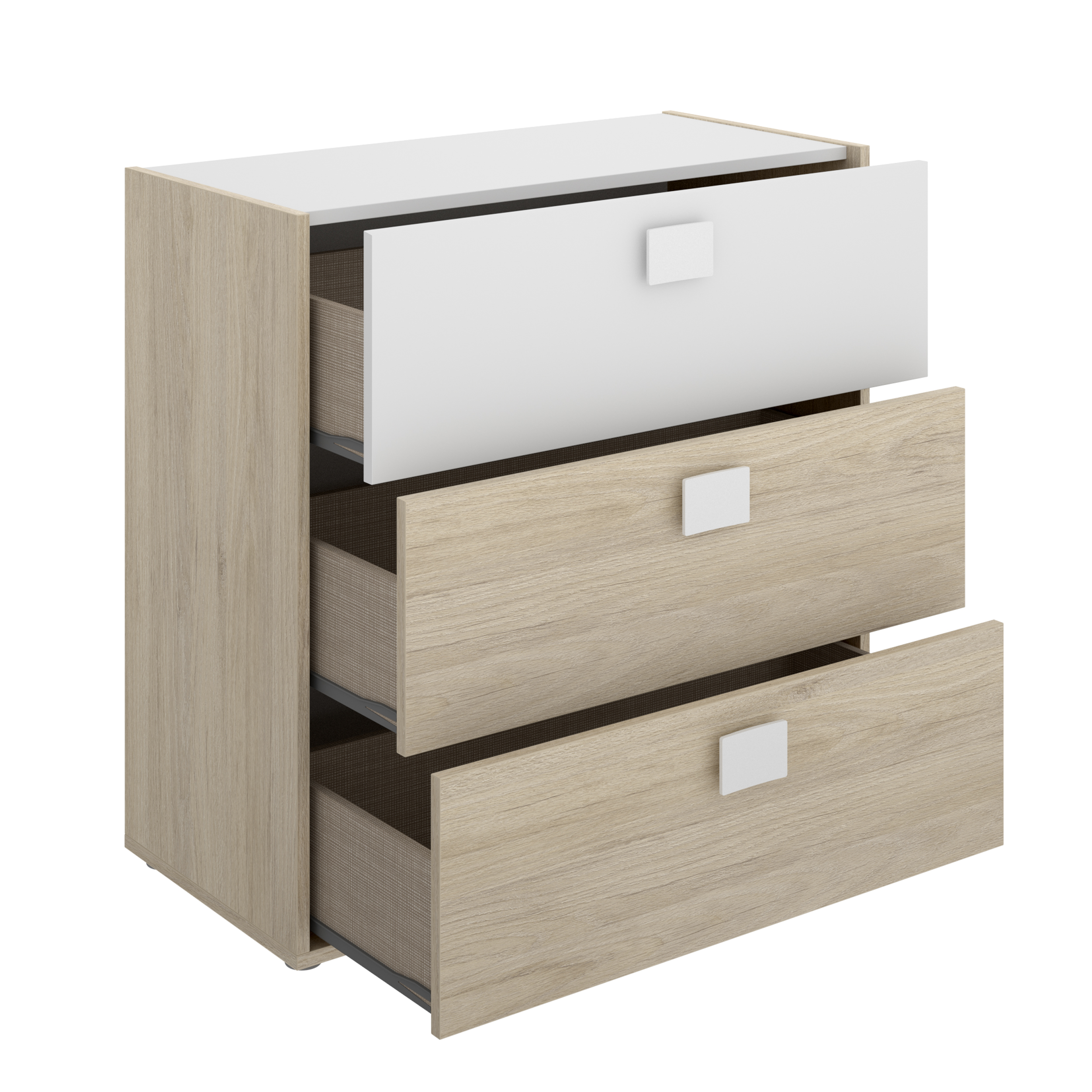 El Mueble Cómoda Modelo Dina tiene 3 cajones muy amplios y resistentes. Gracias a su estructura robusta son capaces de aguantar objetos pesados, por lo que además de ropa podrás guardar otras cosas, siempre de manera segura y organizada.