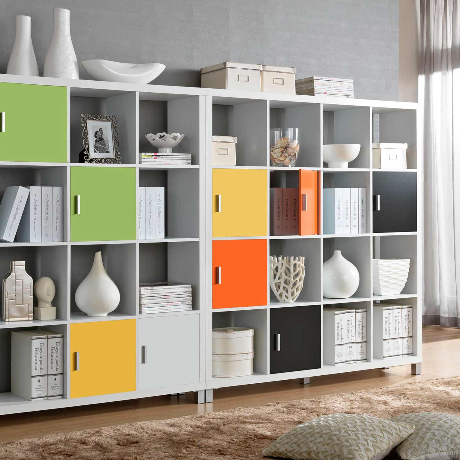 Las estanterías se pueden complementar con puertas y cajones de diferentes colores.