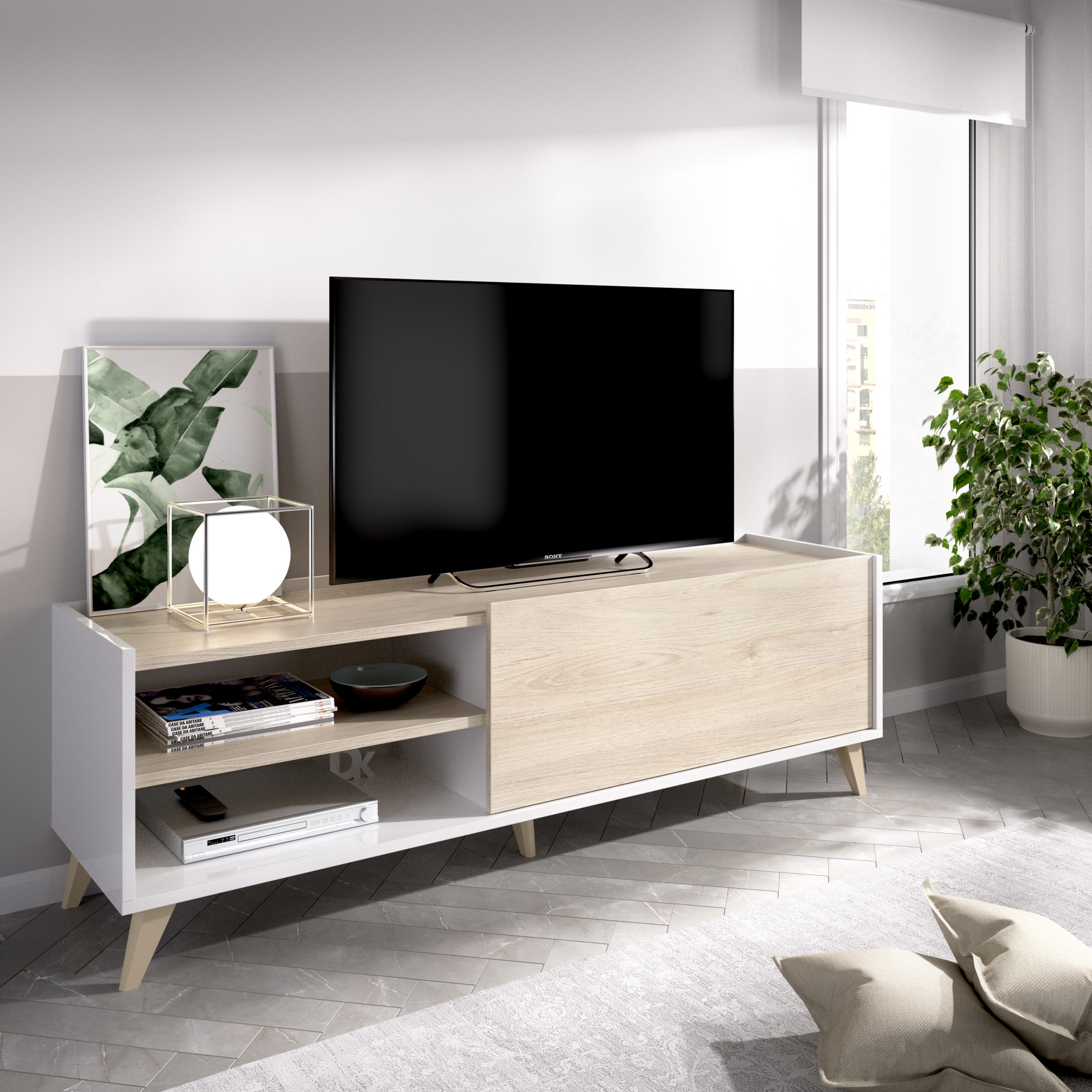 Mesa de TV modelo Ness con 1 puerta abatible, 2 huecos con 1 estante en la zona derecha y 5 patas en color blanco-natural o grafito-natural.