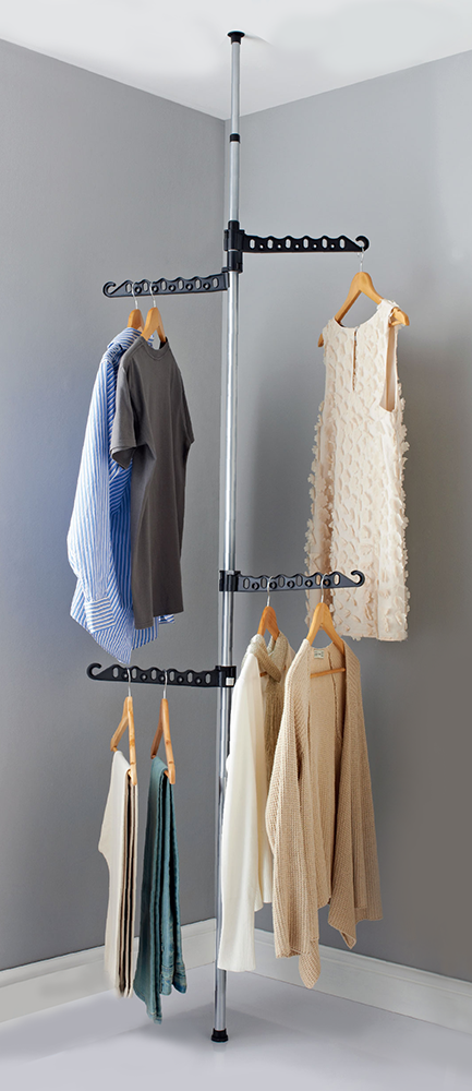 Organizador con barra telescópica y capacidad para 24 perchas. Altura regulable de entre 240 a 280 cm. Funciona con ventosas por lo que se puede ajustar a distintas alturas, no es necesario hacer ningún tipo de agujero.